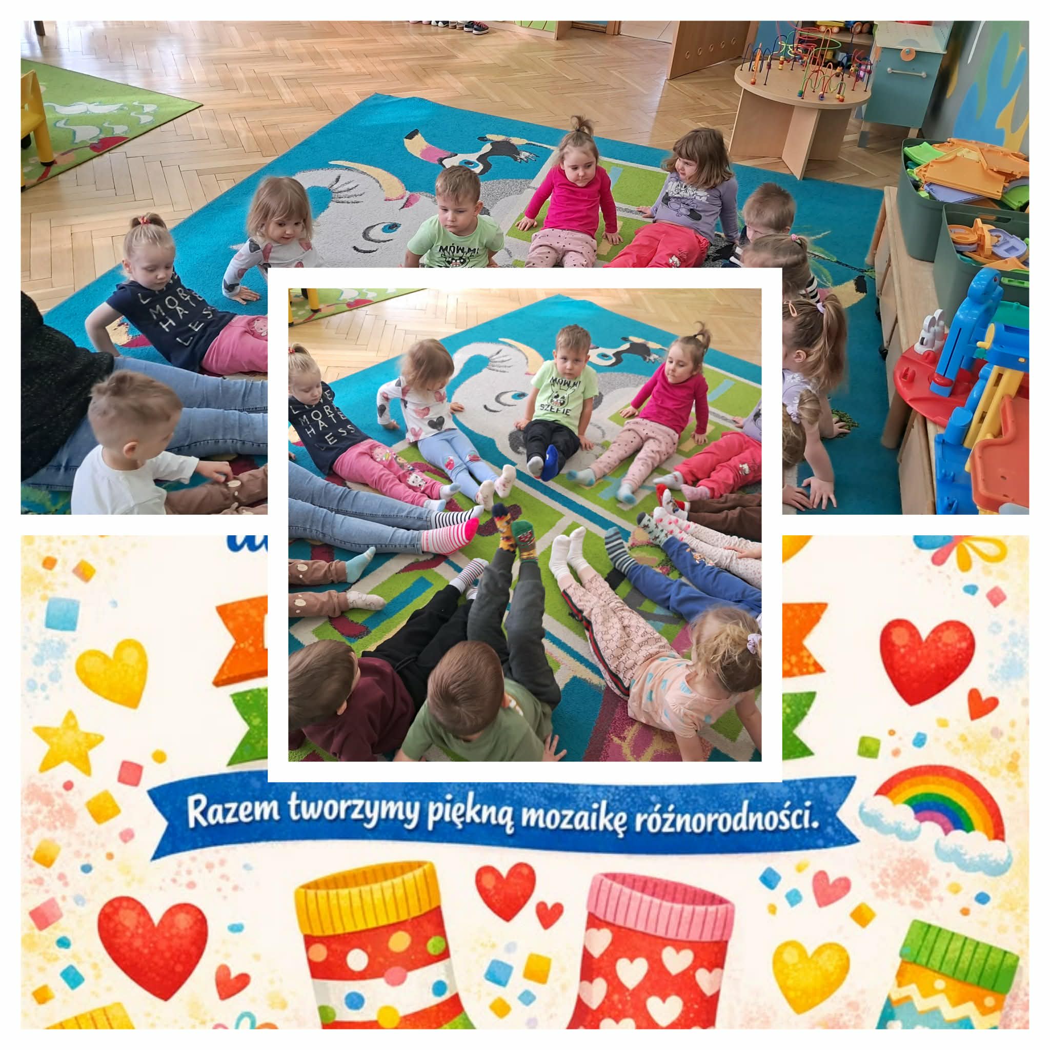 Dzień Kolorowej Skarpetki w naszej grupie był okazją do rozmów o akceptacji i różnorodności. Dzieci przyszły w kolorowych, nie do pary skarpetkach, symbolizujących wsparcie dla osób z zespołem Downa.