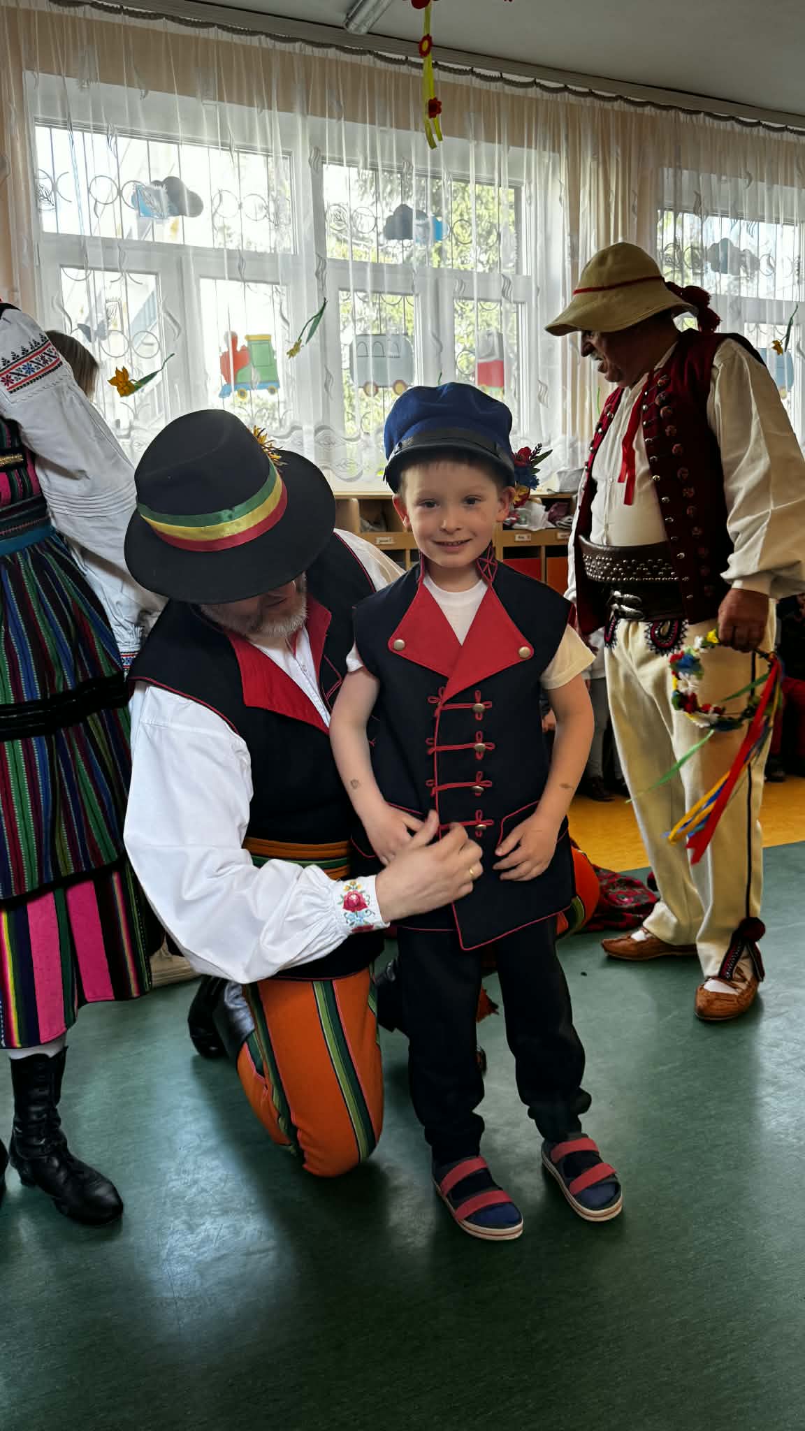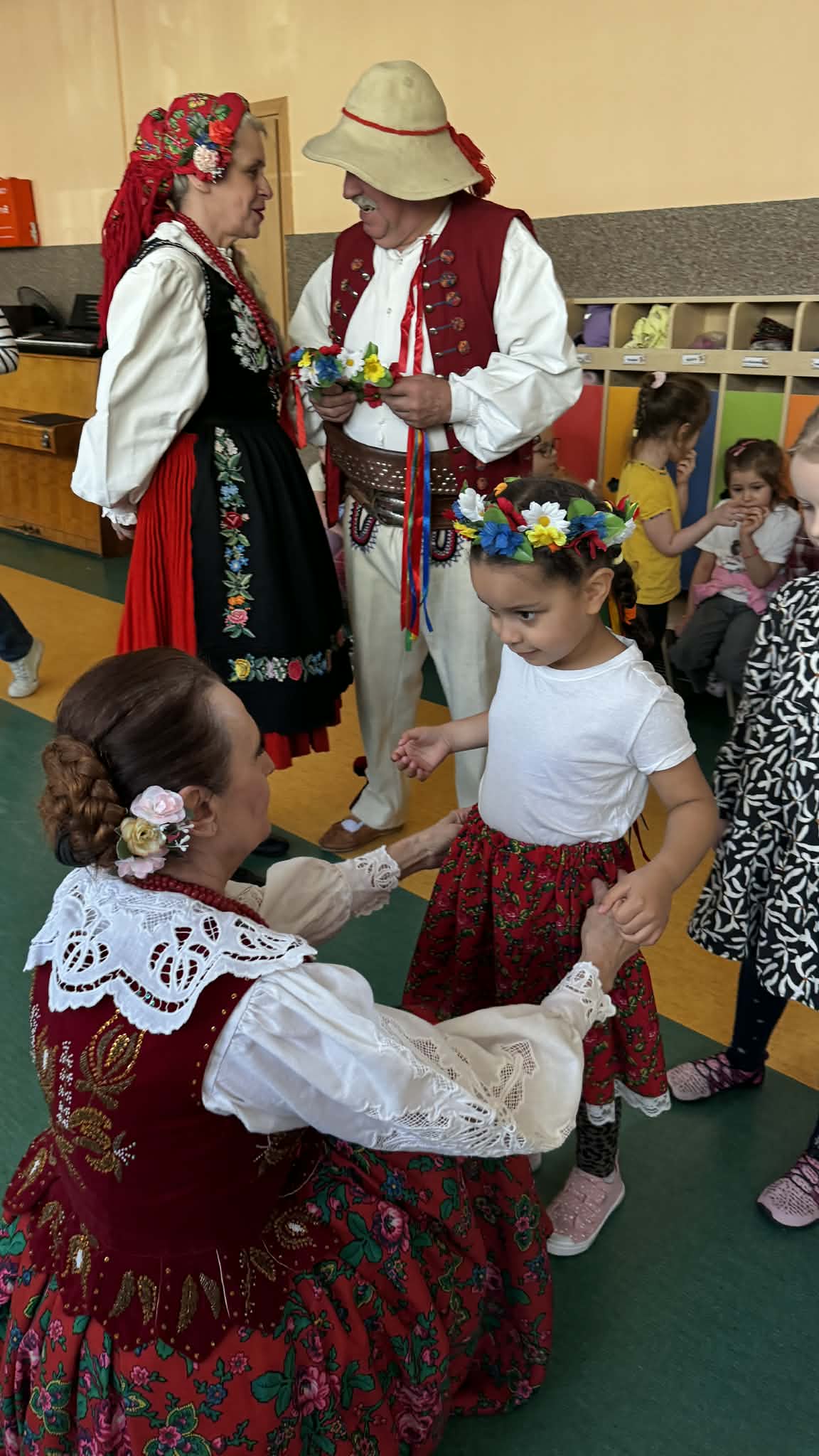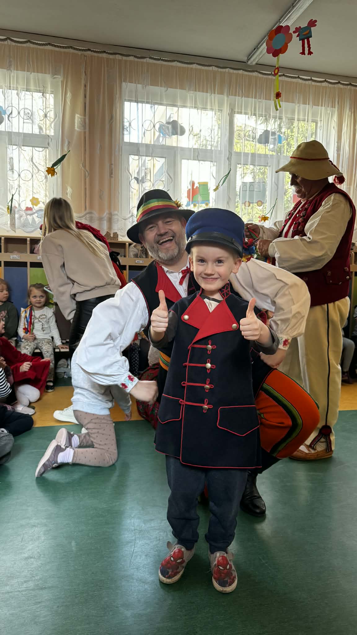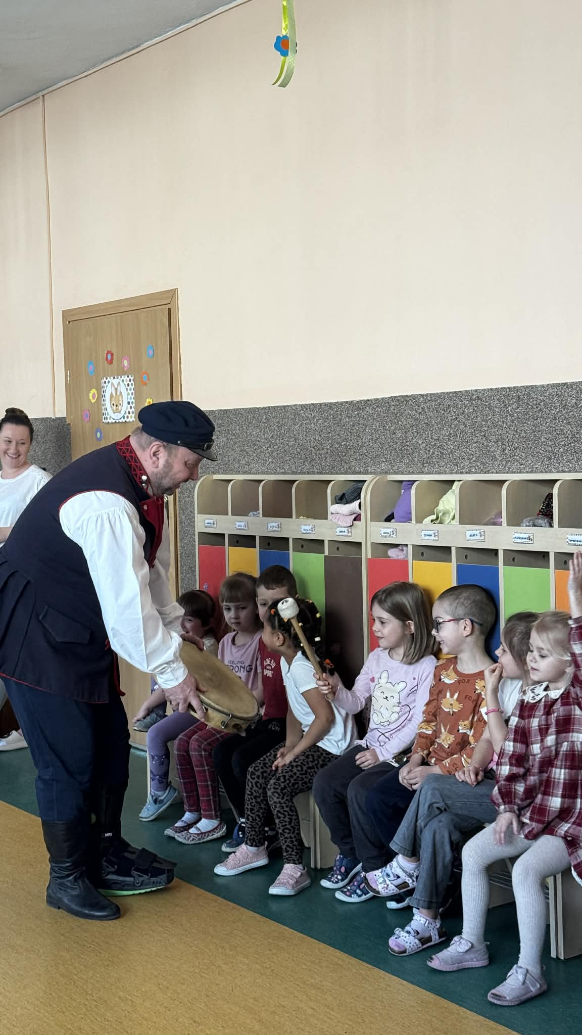 Dn. 18.03.26 gościliśmy w naszym przedszkolu „Zespół Pieśni i Tańca" Dobroń. Podczas spotkania dzieci miały okazję poznać tradycyjne instrumenty, zobaczyć piękne stroje ludowe oraz posłuchać i wspólnie zaśpiewać wesołe przyśpiewki. Było to radosne i bardzo inspirujące spotkanie z kulturą ludową.