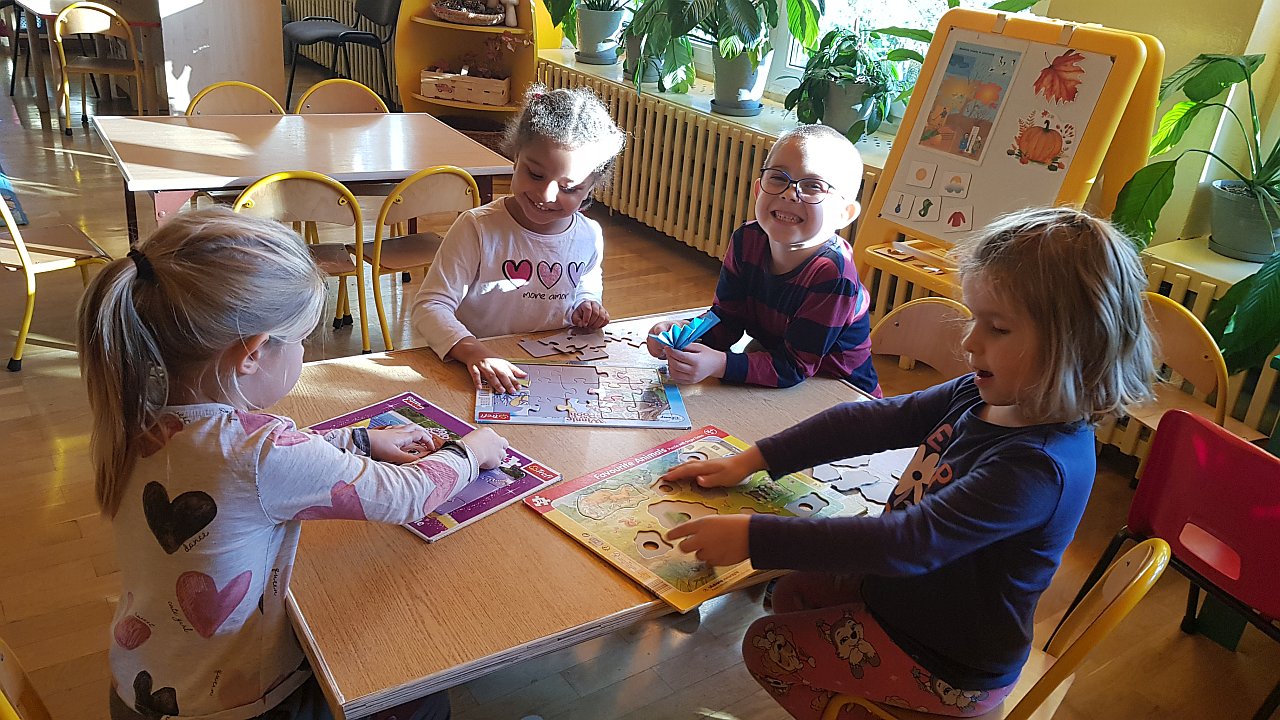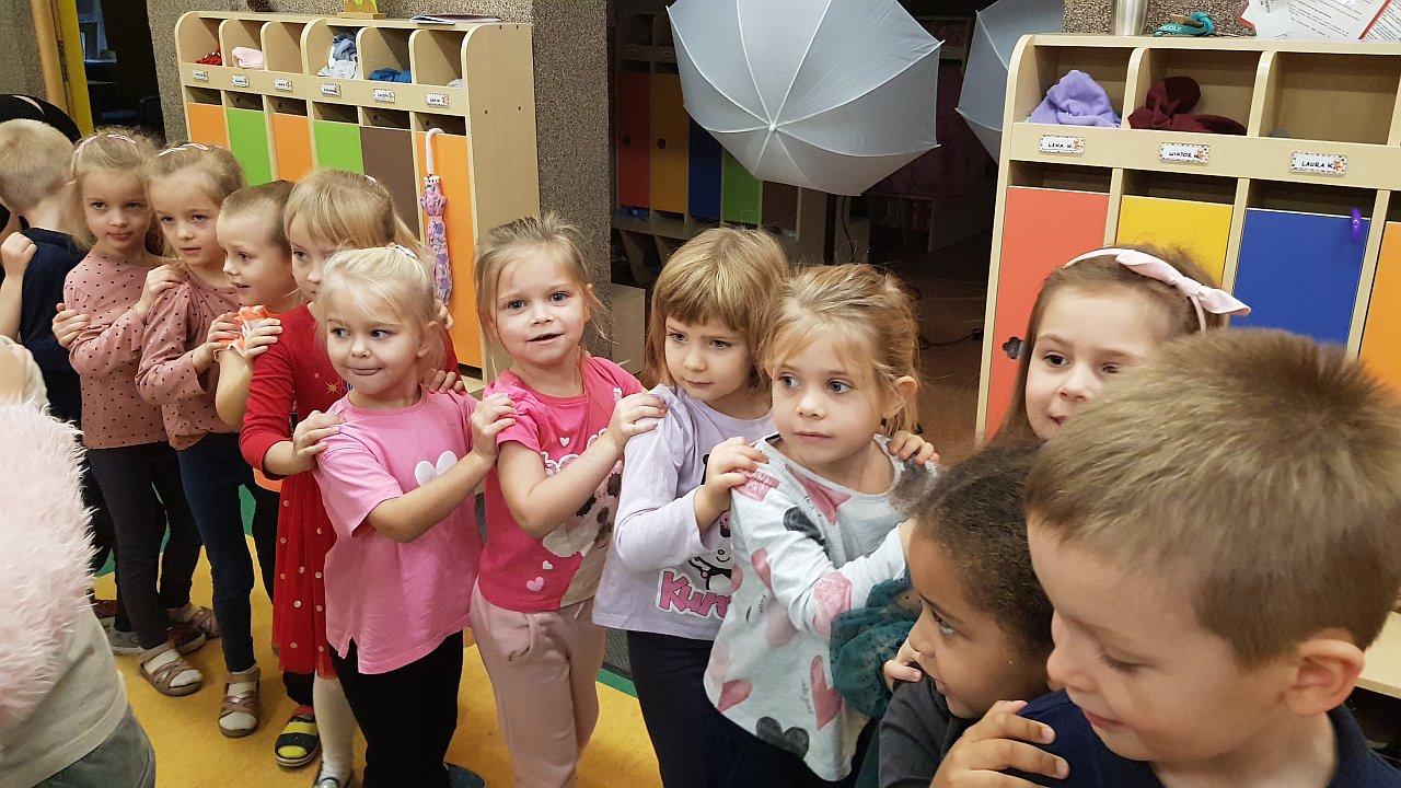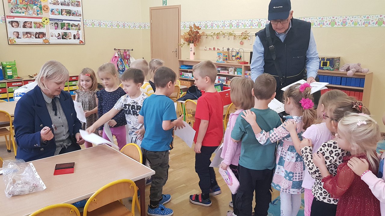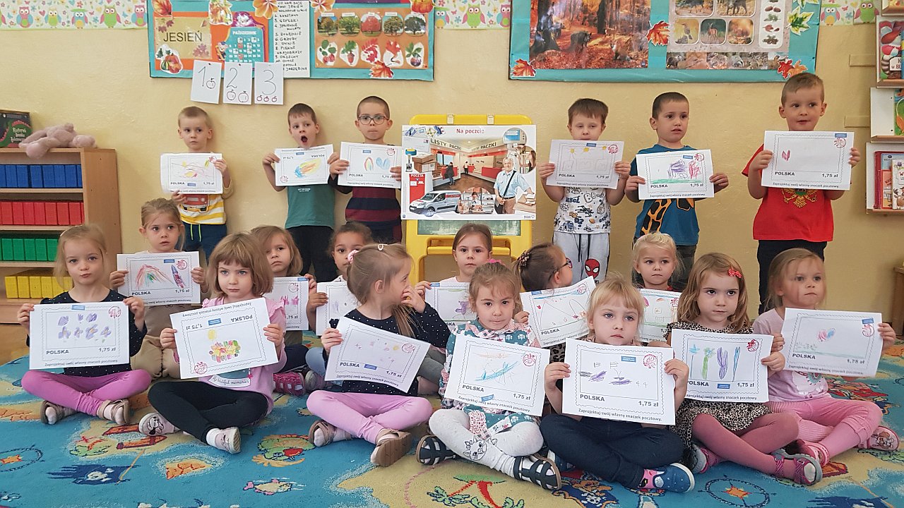 Kolejny temat to przygotowania zwierząt do zimy. Słuchaliśmy opowiadań na ten temat, tworzyliśmy opowieści do historyjek obrazkowych, oglądaliśmy filmy edukacyjne i rozwiązywaliśmy zagadki. Poznaliśmy literę A, a i odkryliśmy zapis liczby 3. Odwiedzili nas przedstawiciele Poczty Polskiej; opowiadali o swojej pracy, co możemy załatwić w urzędzie pocztowym, wcieliliśmy się w rolę pracowników poczty.